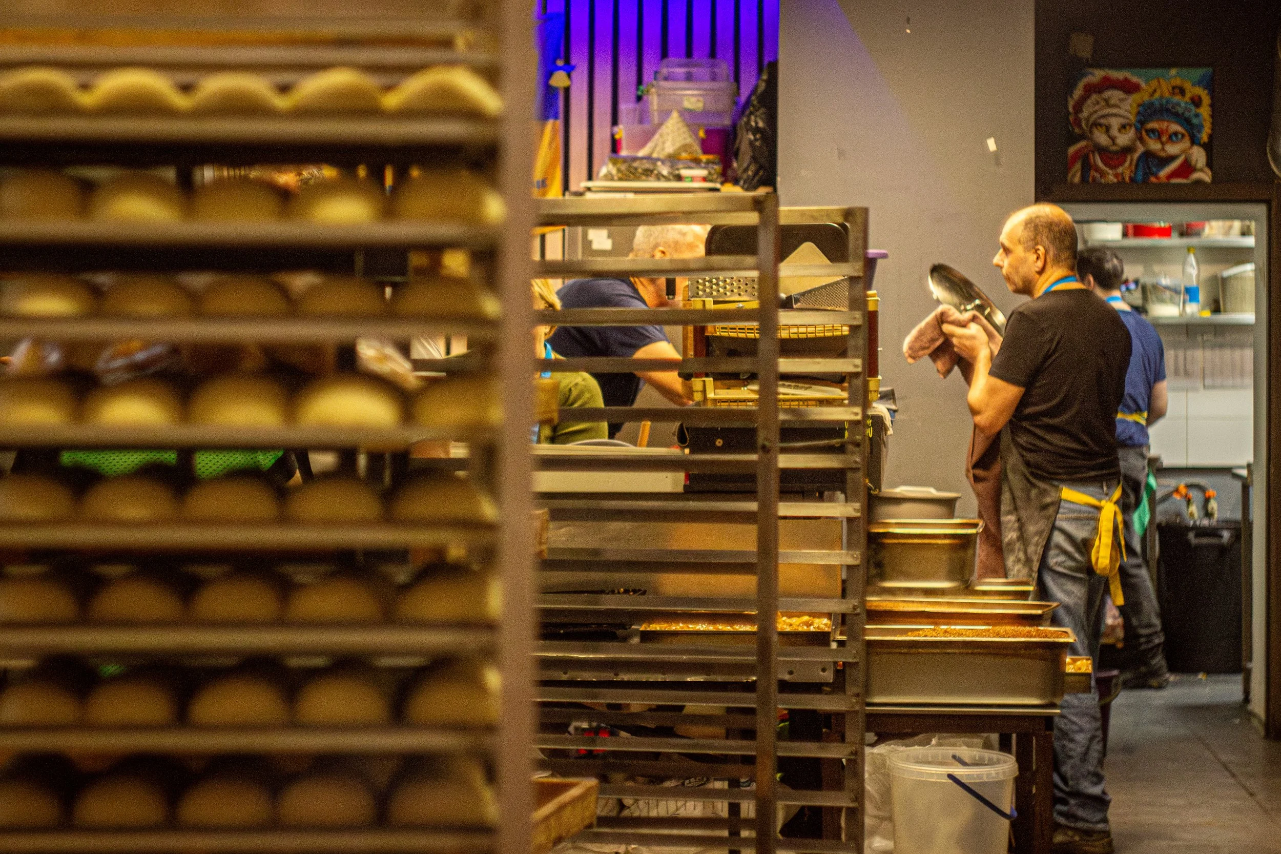 Mit einer Gruppe von Freiwilligen kochen sie täglich warme Mahlzeiten und Brot für bis zu 1.500 Menschen. Die meisten Mahlzeiten werden an Krankenhäuser in Charkiw geliefert.